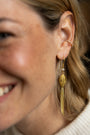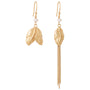 Het ene oor siert een goudkleurig blad met elegante kettinkjes die zachtjes meebewegen bij elke stap. Het andere oor brengt een subtiele balans met een dubbele bladvorm, tijdloos en stijlvol.