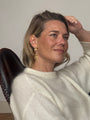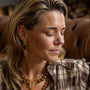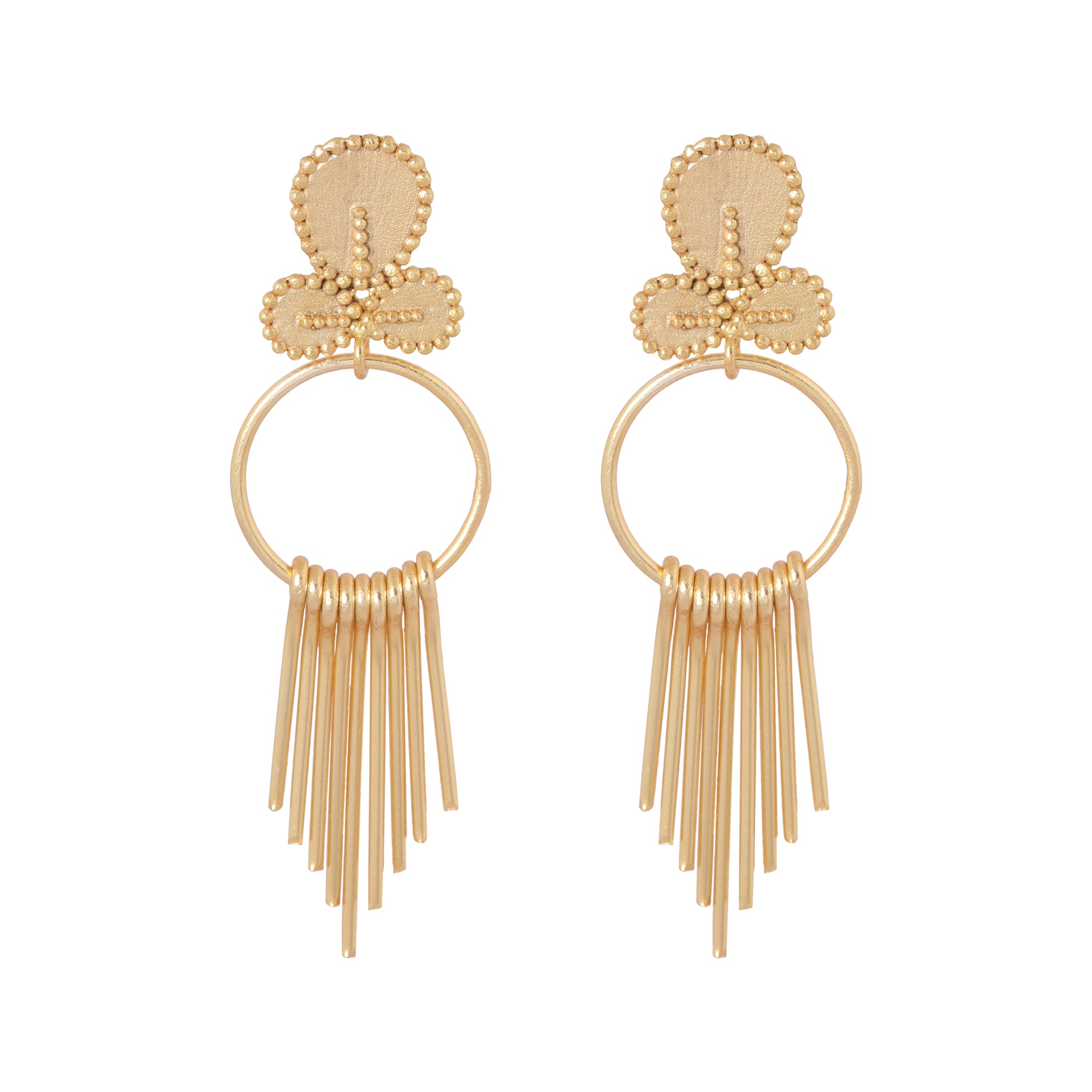 Aurine is een elegante oorbel met karakter. De bewerkte steker met bolletjesdetail loopt over in fijne, vallende staafjes die zacht meebewegen. Handgemaakt in Bali en verguld met 18-karaats goud — stijlvol, licht en tijdloos.