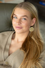 Deze oorbel bestaat uit 2 delen. De achterkant is 18-karaats verguld bedekt met grijs leer. Daarvoor hangt een mooi opengewerkt verguld motief.