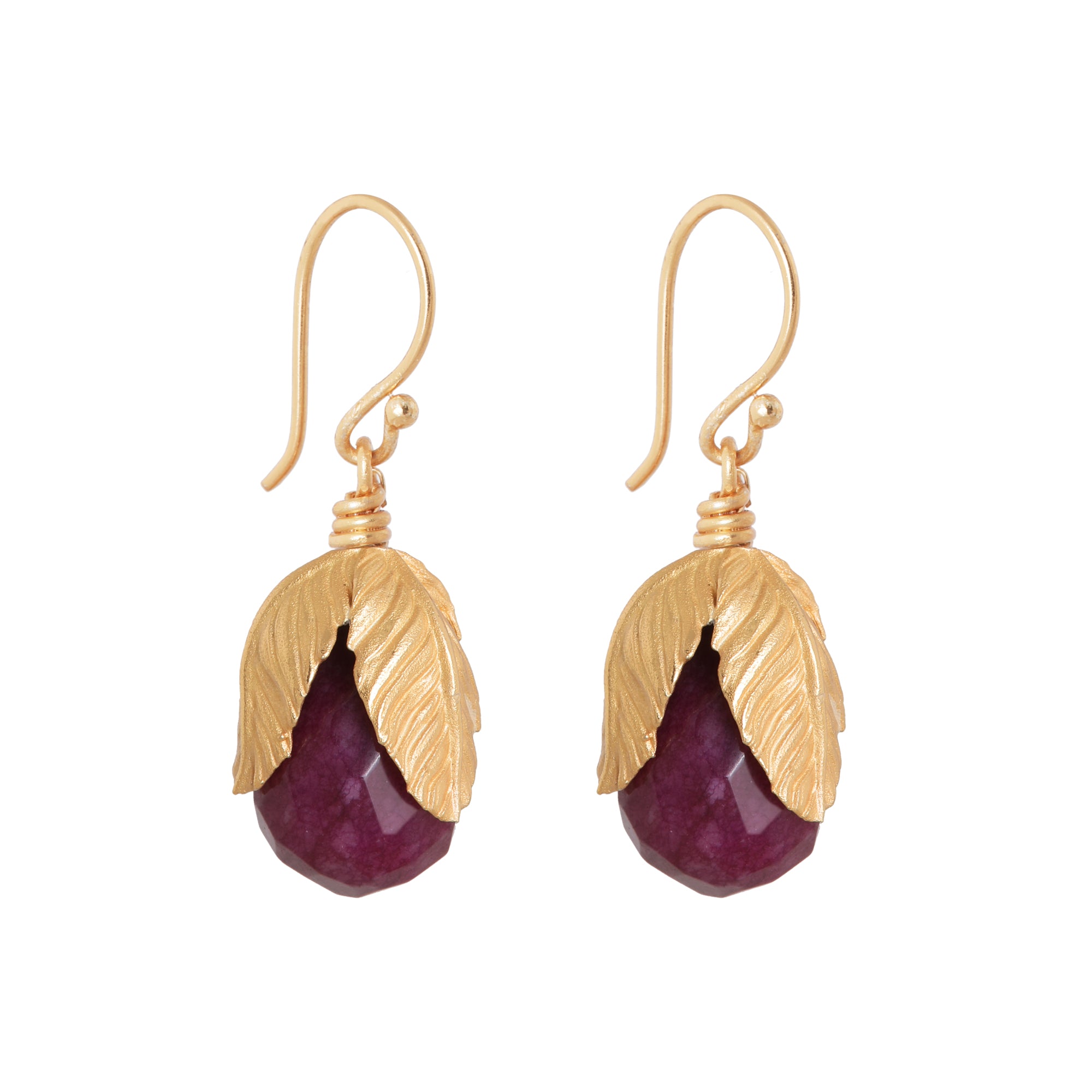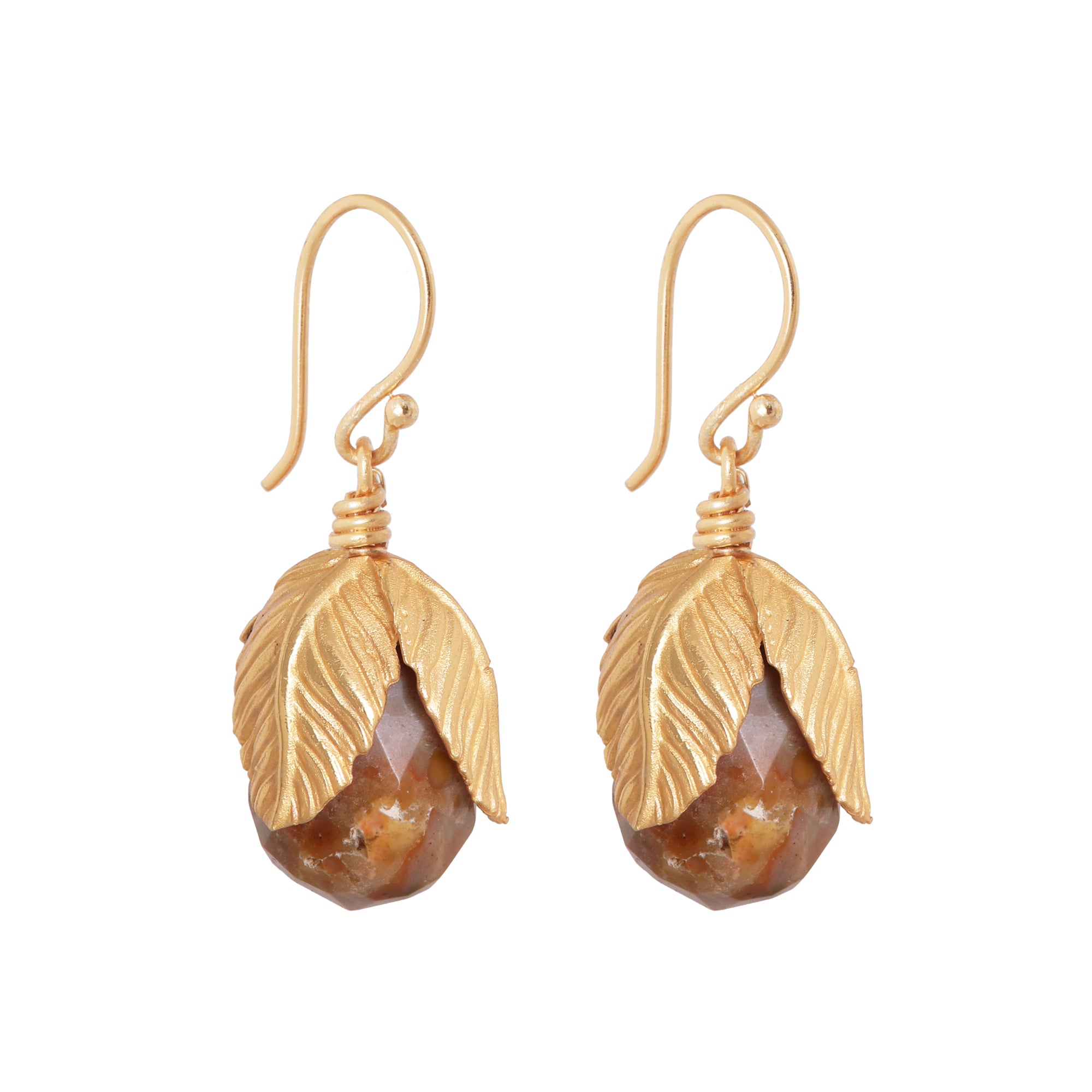 Een ode aan de natuur. De steen, met haar zachte tint en facetten, wordt omlijst door een verguld blad dat zich als een sieraad om haar heen vouwt.