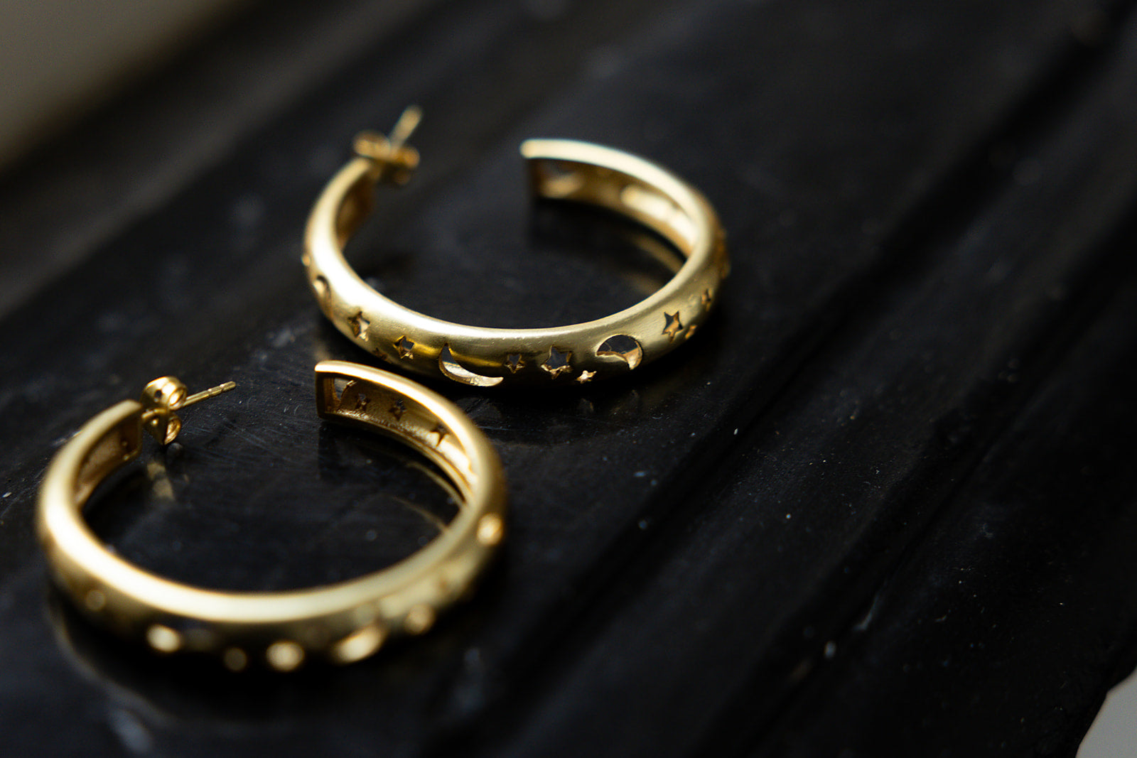 De 18-karaats vergulde hoops, is uitgesneden met maan- en stervormen die subtiel het licht vangen.