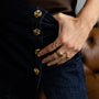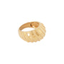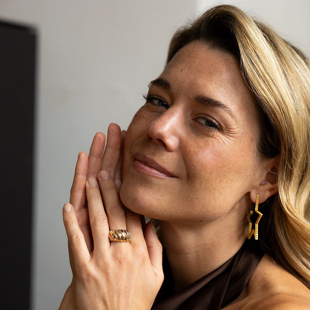 De Ravel Ring is een sculpturaal statement met een verfijnde twist. De ring bestaat uit golvende banen met subtiele koorddetails die sierlijk in elkaar overvloeien. 18-karaats verguld en vol karakter — een moderne klassieker die elke look kracht en elegantie geeft.